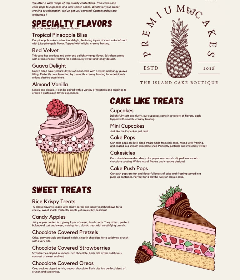 Indulge in our wide selection of flavors, each crafted with high-quality ingredients for cakes, cupcakes, and desserts that stand out. From classic flavors to unique seasonal options, our menu at The Island Cake Boutique has something for every taste and occasion. Customize your cake with flavors that perfectly complement your celebration and delight your guests. Explore our full flavor list and find the ideal pairing for your event!